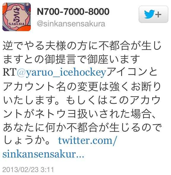 | 特定アカウント (N700-7000-8000 / @sinkansensakura) とのやり取りについて |